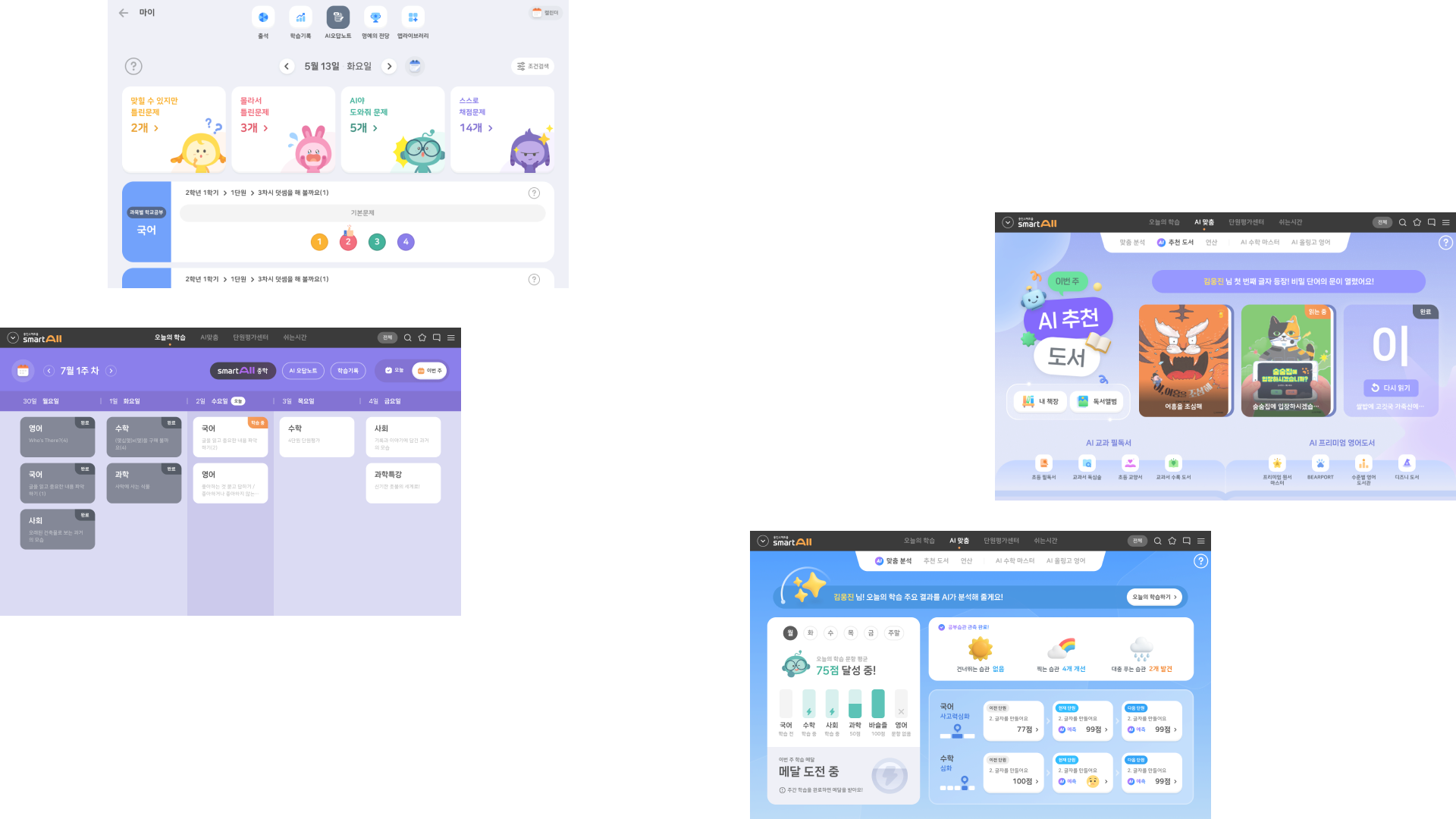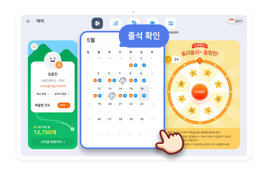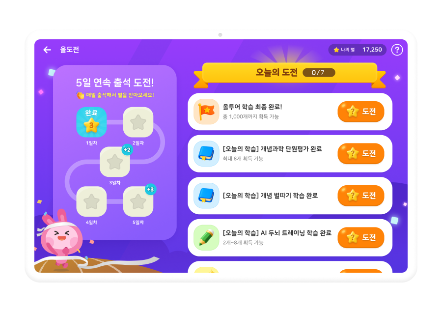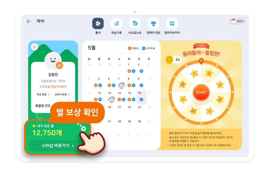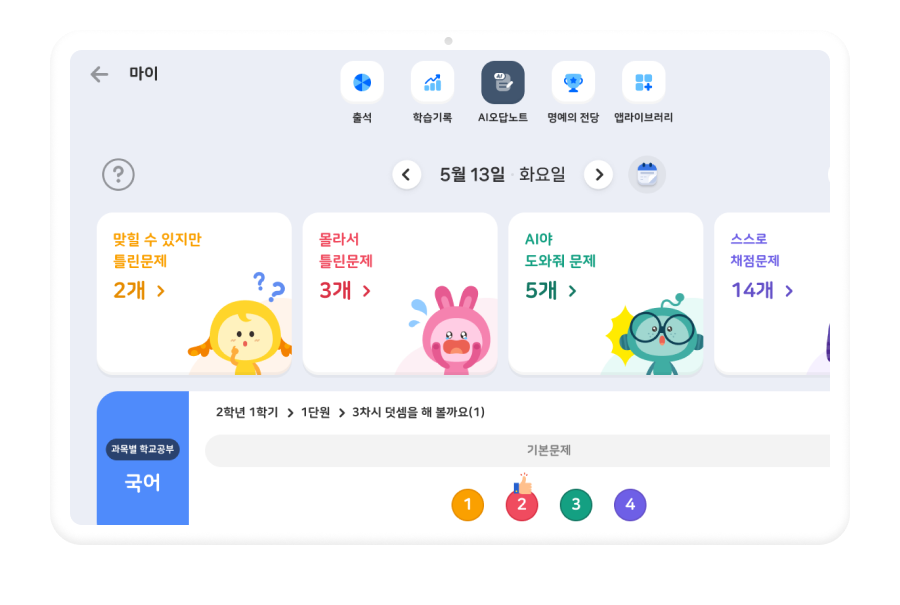 마이 페이지에서 출석, 별 보상, 학습 기록, AI 오답 노트 까지